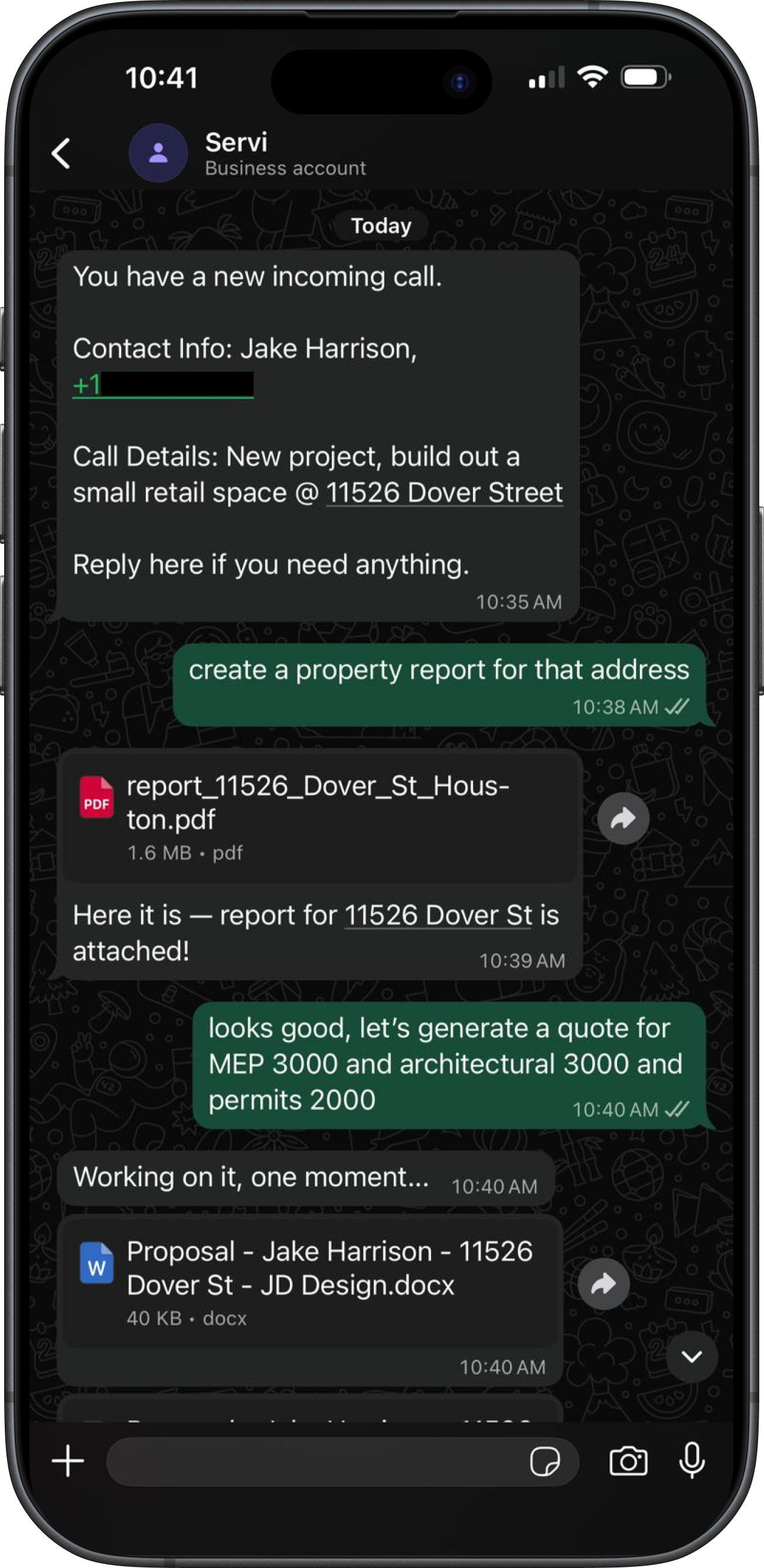 Servi messages you with the call info. Ask for more details or paperwork, just like texting an assistant.